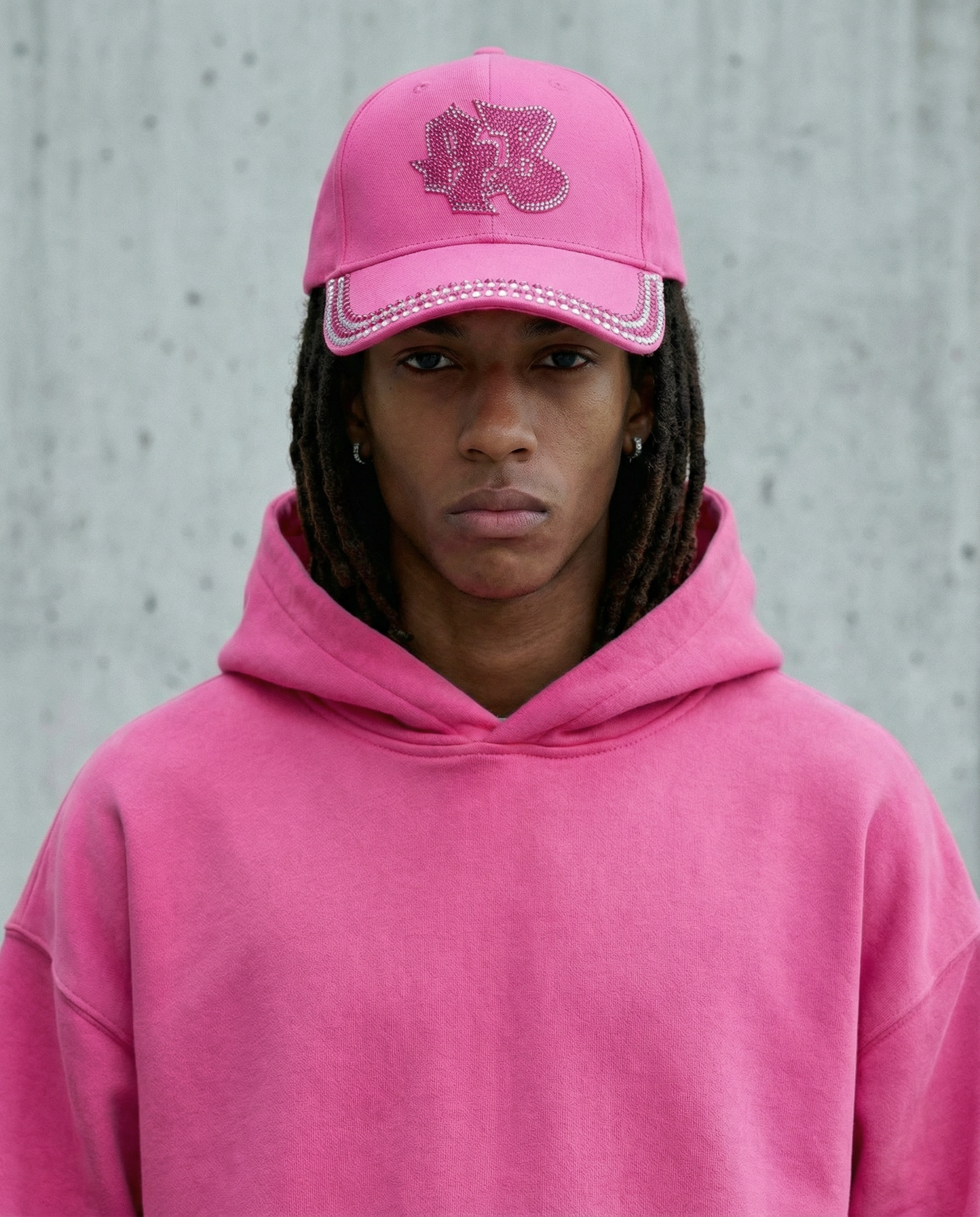 Entièrement rose, structurée, frontale assumée, elle porte le monogramme RB en strass, posé comme un symbole.